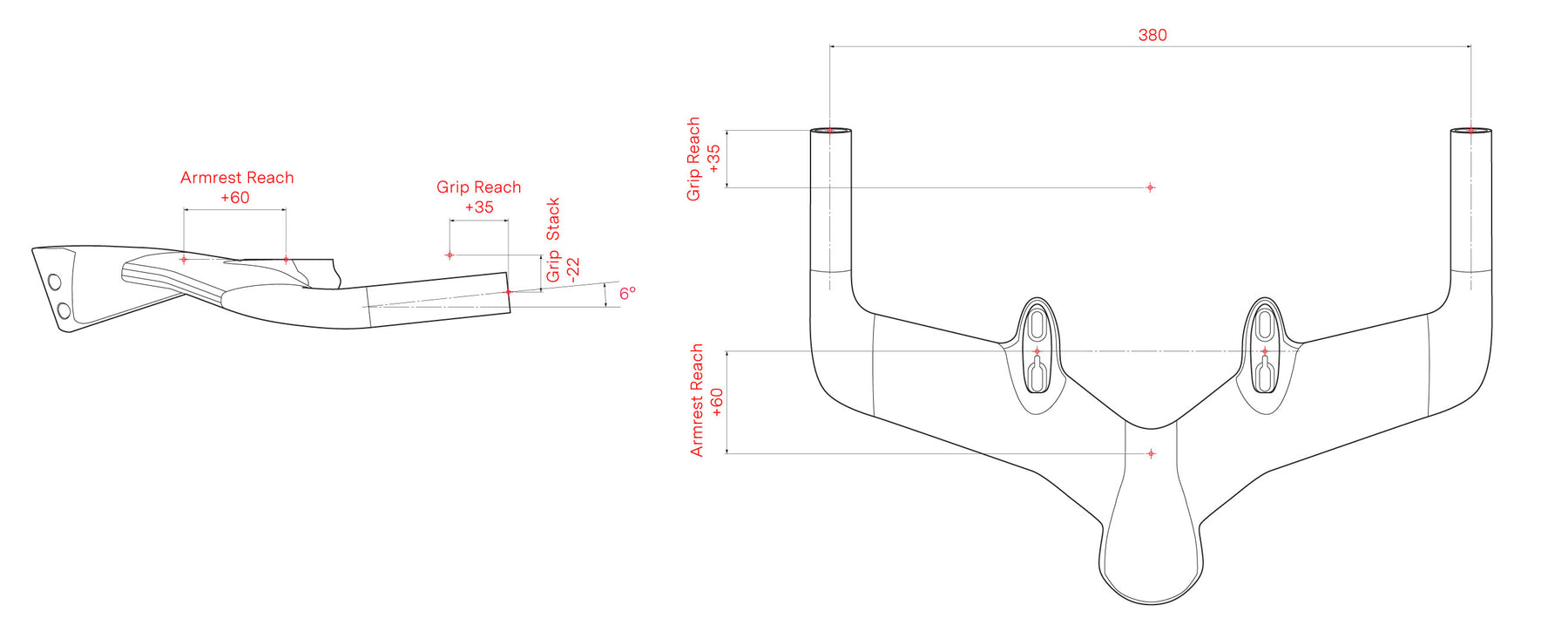 Lo Speedmachine Base Bar Team è un manubrio richiesto dal nostro BMC Triathlon Team, progettato per ottenere una posizione più aggressiva rispetto al manubrio originale “Flat”. Mantiene lo stack originale dei braccioli, ma estende il reach di +60 mm. Anche i punti di contatto dell'impugnatura sono più aggressivi, con uno stack ridotto di -22 mm e un reach aggiuntivo di +35 mm. L'angolo di presa è inclinato di +6° per garantire un migliore controllo durante la frenata.